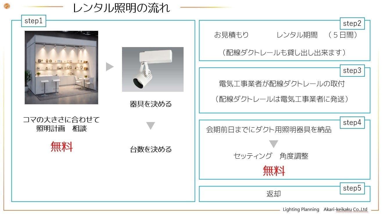 展示物やブースデザインに合わせた訴求効果のある照明器具の選定と設置位置のサポート付の照明器具のレンタルサービスを是非ご利用ください。